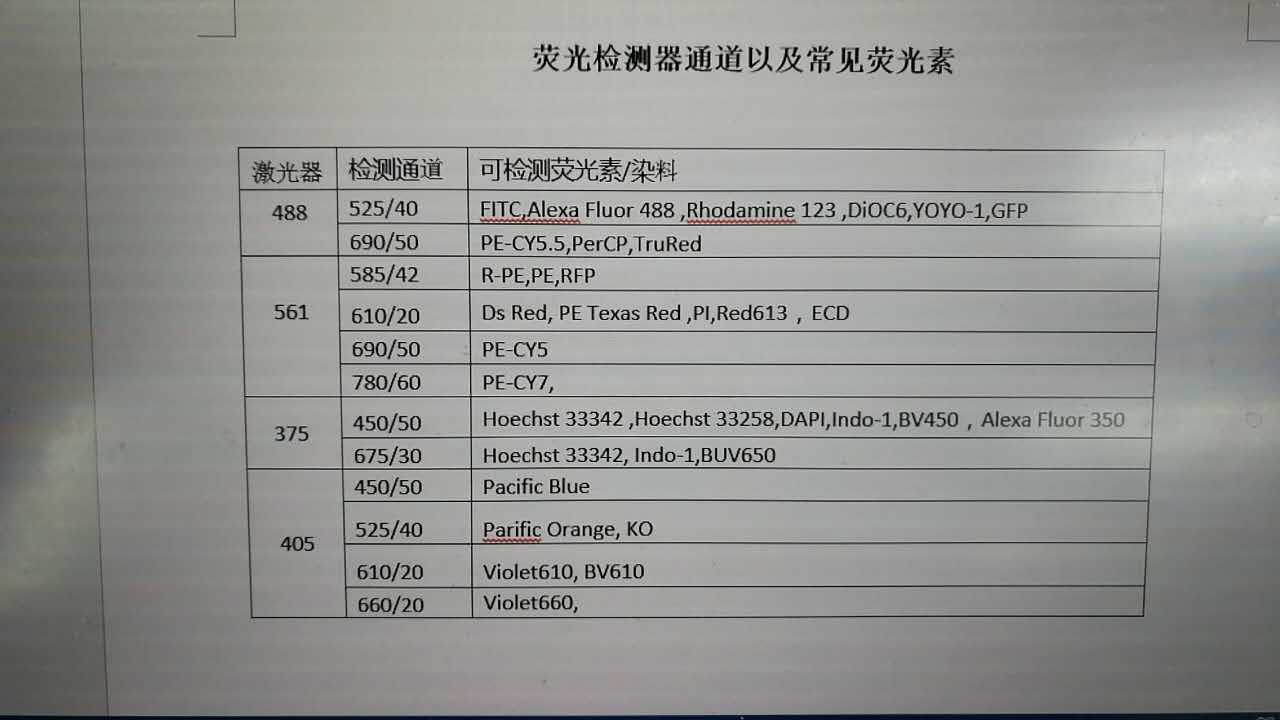 仪器配置(激光器及检测通道)及可检测荧光素/染料见下表: