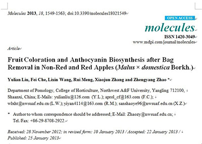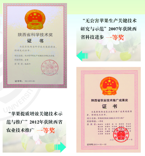 They have published in total more than 200 academic papers including more than 15 SCI papers. They got one “First prize of Shaanxi province scientific and technological progress in research and demonstration of key technique for no-harmful apple production ” in 2007, and one “First prize of Shaanxi province agriculture extension in the demonstration and expansion of key technique for improve the quality and increase and economical benefit in apple" in 2012. In addition, they have awarded eight items of national patents.