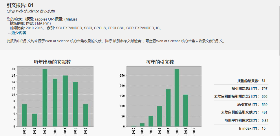 近五年团队苹果相关SCI论文的发表及其引用情况