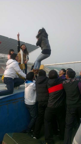 在进行游戏时,大家情绪都很高涨,每个人都跃跃欲试。第一个进行的游戏是“信任背摔”。游戏规则是:由男生手拉手在高台下结成“人床”,女生站在高台上直立而下。这个游戏很大程度的考验了同学之间的信任,很多女同学一开始都不敢直接从高台上躺下来,即使摔下来也是弓着身子坐下来,使得男生不能成功的接住她们。于是,我们的班长就给大家鼓劲,让大家相信彼此,男生们更是大声呼喊:“我们准备好了,相信我们吧!”。女生们都被这士气鼓舞了,一个个勇敢的自由落体,大家在每一次成功的欢呼声中雀跃不已。每一个同学坚定的眼神仿佛就在高速大家:“我很相信你!”。