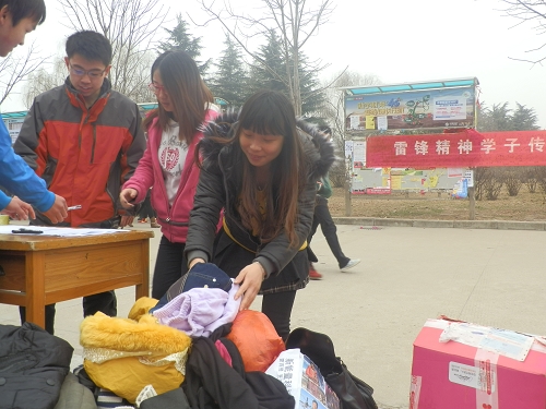 3月5日中午,由公司联合葡酒、动科、食品、人文四个公司,在西区雕塑前开展的“暖春”旧衣旧物募捐活动。