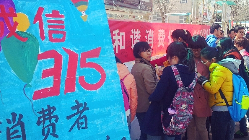 同学贴起“和谐消费促发展,维权意识进校园”的横幅,并邀请过往同学们在横幅上签名以示对活动的支持。不仅仅局限于象征性的签名表态,同学们还通过组织发放传单和进行有奖竞猜活动等方式来提高大家的积极性,使大家在参与活动的同时,真正了解到一些有关消费者维权的知识,能够在日常生活维护自己的权益。本次活动中,有奖问答环节很受欢迎。在此环节中,同学们都踊跃回答问题,不仅赢得了丰富的奖品,还增长了在依法维权方面的知识。