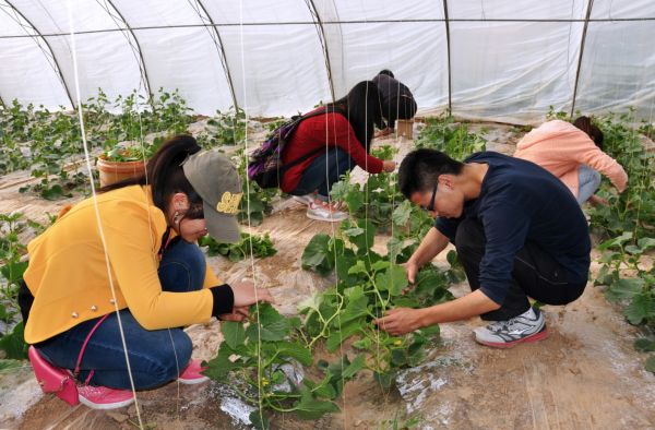 田园使者在了解了合作社基本情况后,便一同与农户们深入温室大棚,开展生产劳动。在温室大棚管理员的指导下,队员们对大棚里面甜瓜苗和西瓜苗进行整枝、压蔓和摘心处理,这一看似简单的农活,却难倒了不少队员,队员们反复琢磨、认真实践。天气很热,温室大棚内气温更高,但大家的热情不减,在队员们的相互合作下,工作圆满完成。看到自己辛苦劳作的成果,想象着以后这些苗子硕果累累的画面,队员们露出了欣慰的笑容,快乐之情溢于言表。