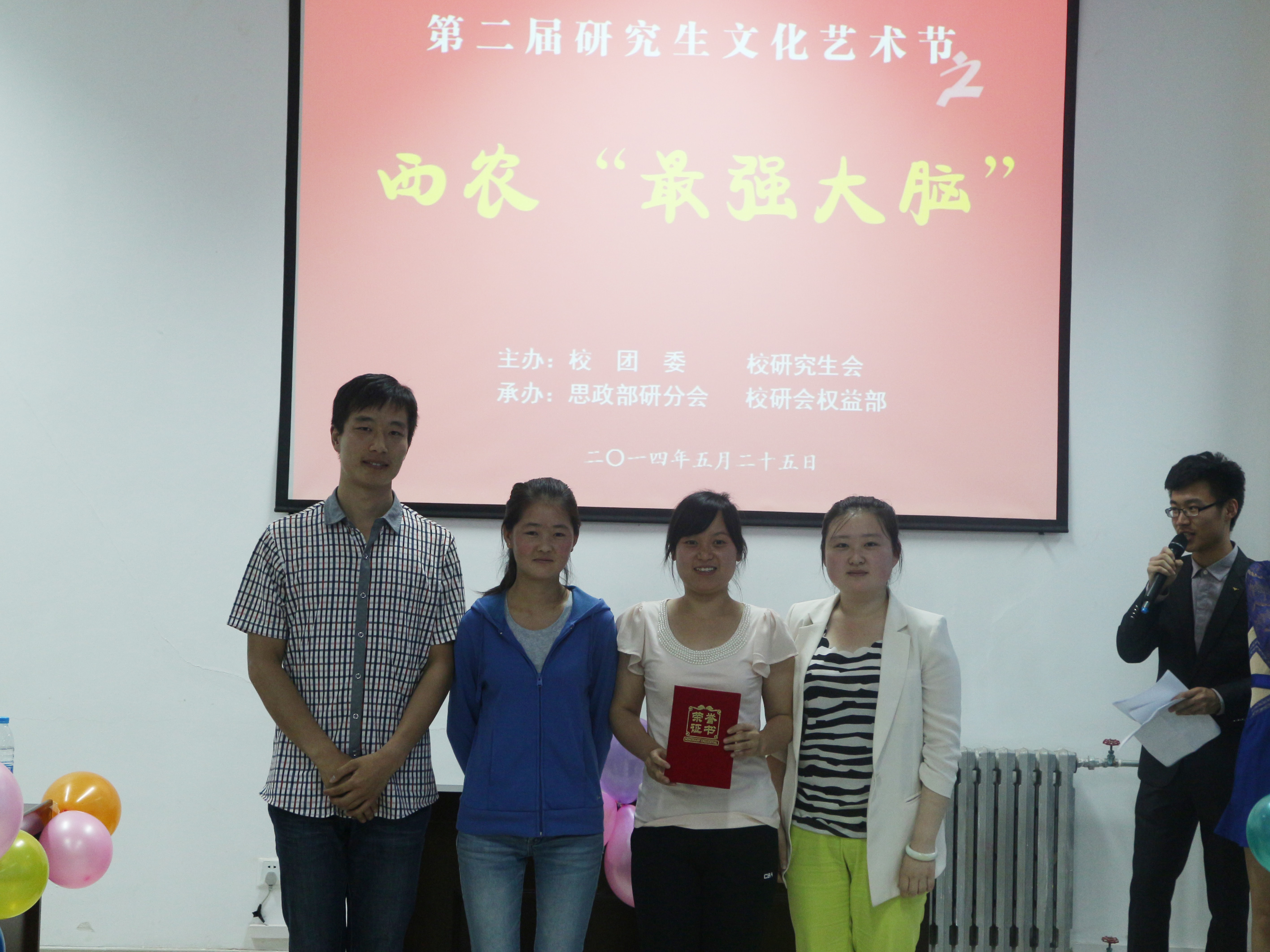 2014年5月25日下午,第二届研究生文化艺术节之西农“最强大脑”活动在南绣山报告厅成功举办,公司代表队赛前积极备战,一路高歌猛进,最终进入决赛,获得第二名的优异成绩。