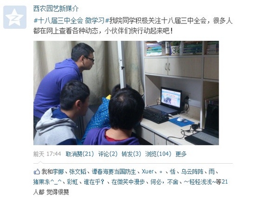 据专业人士分析,在接下来为期四天的三中全会中,新一届国家领导人将围绕“研究全面深化改革等重大问题”展开集中分析讨论。为了更好地了解此届三中全会,公司学子积极关注三中全会。在宿舍电脑旁、书桌前,几个员工围在一块,边看边讨论会议的进程。广大学子通过微博、人人等网络媒介详细了解会议最新动态。园艺123班员工丁文龙感慨道:“三中全会的召开是国家的大事,我们每个人都应积极的去关注。尤其作为农林院校的员工,更应跟上国家的步伐,为实现美好的中国梦而努力”。