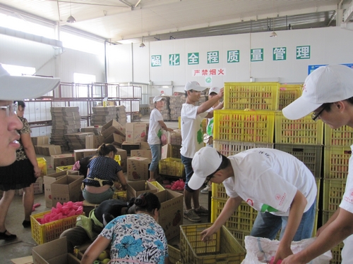 参观气调库和生产线之后,我们一行人跃跃欲试,尝试给苹果套包装袋并装箱子,两人一组,虽然手法不太娴熟,但我们尝出了劳动中蕴含的无穷乐趣。别小看给苹果套包装袋这样一个简单的动作,这其中可有着特别的讲究和很大的学问呢;俗话说,“实践出真知”,通过这次锻炼,我们了解了生产过程中的细节知识,也深刻地领悟到了“科学技术是第一生产力”的实质内涵:在企业运行中,每一个环节都离不开科学技术的支撑。