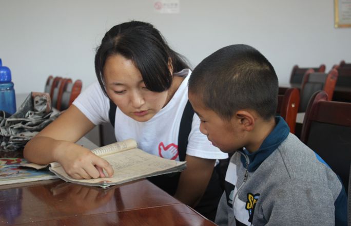 9:00,队伍赶到支教地点。通过了解,孩子从一年级到初一不等,于是队长及时把活动调整为一对多的辅导模式,将同一级的分为一组由一个队员负责。队员在接到队长的安排后,针对自己所辅导孩子的需要开展了自己的活动。队长她辅导的孩子是三年级的孩子,主要给孩子辅导作文和乘法口诀表的诵读。