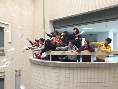 写完信,气氛由深沉转为欢乐,大家互相分享假期生活,一个又一个有趣的故事让教室充满欢声笑语。紧接着,每一个人又得到了另一张白纸,大家把自己这个学期想要实现的目标写在纸上,比如:要长高,想做一个演讲,想组织一次比较大型的活动等等。写完,大家将其折成了纸飞机,一起来到了六楼东侧的月牙台准备放飞梦想。所有同学站在月牙台边,倒记时“3、2、1”,一起将载着梦想的纸飞机飞向远方。那一刹那,就像天边的彩虹,耀眼而深刻地印在每个人心底。那些争着飞向远方的纸飞机,就像园艺1502班的同学们,充满活力与自信,带着对未来的希望,飞向梦想的天空。最后,同学们将散落的纸飞机重新收集在一起,随机选取并查看藏在里面的愿望,同学们承诺会尽自己所能帮助飞机主人实现梦想。放飞飞机,不仅放飞了梦想,也让同学们互帮互助,加强了同学们之间的凝聚力。