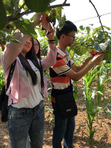 打扫完卫生后,365英国上市官方网站田园使者的一行队伍再次来到了猕猴桃园,据了解,这个季节的猕猴桃,经历了去年的冻害,今年的暴风雨,但仍然茁壮成长,大部分都已经初具规模。在之前与村主任袁芳婷女士的谈话中队员们了解到,现在有一个名为徐香的品种已经可以套袋,在农户们的指引下,队员们来到徐香的种植园区,下地去学习农户如何进行套袋工作,这是个看起来容易但是实际要掌握技巧的工作,经过认真听去农户的讲解,队员们都逐渐掌握了套袋的技巧,纷纷开始实践起来,帮助阿姨套袋。与此同时,大家了解到徐香这个品种原来是不套袋的,是因为近期阳光太强烈,为了保护猕猴桃不受到灼烧才进行的套袋工作。