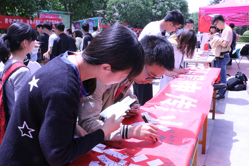 为继承和发扬五四运动的光荣传统,弘扬中华民族伟大精神,深入贯彻落实科学发展观,积极引领公司团员青年与公司同发展,为创建和谐、平安、幸福校园贡献力量、奉献青春。在五四运动98年之际,365英国上市官方网站与经济管理公司5月4日中午在北校区西区雕塑前共同举办了“五四精神传薪火,激扬青春献祝福” 的签名活动和“我与团徽合个影”的活动。