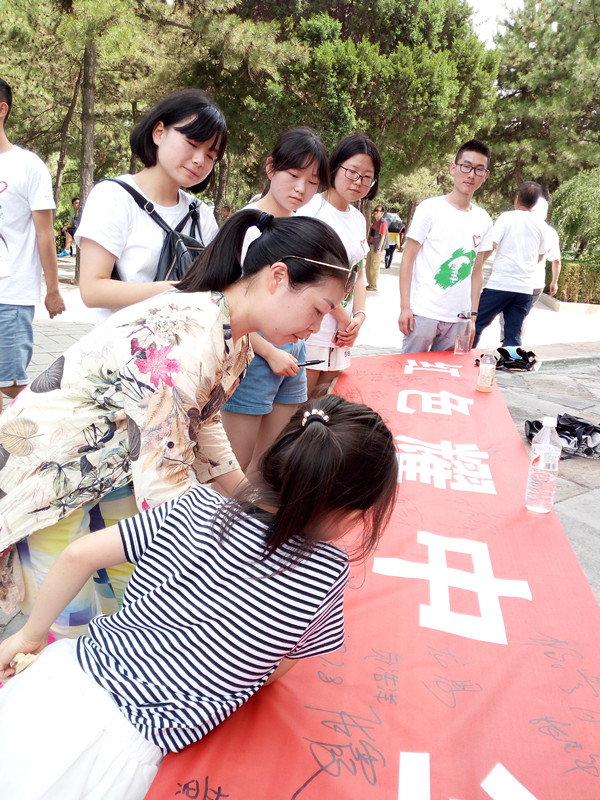 宝塔下红色的横幅很快便吸引了大批的游客前来参与,他们纷纷在横幅上签下了自己的名字,并同队员们一起表明了传承延安红色精神的决心和信心。 一位已经年过花甲的老爷爷向队员们说:“在我们那个年代,红色精神影响着每一个人成长,也是建设新中国的精神支柱。当我看见你们的横幅时,我深有感触,我希望你们这一代人可以把它发扬光大。”队员们对此感动不已,纷纷表示将为红色精神的继承和发扬贡献自己的绵薄之力。