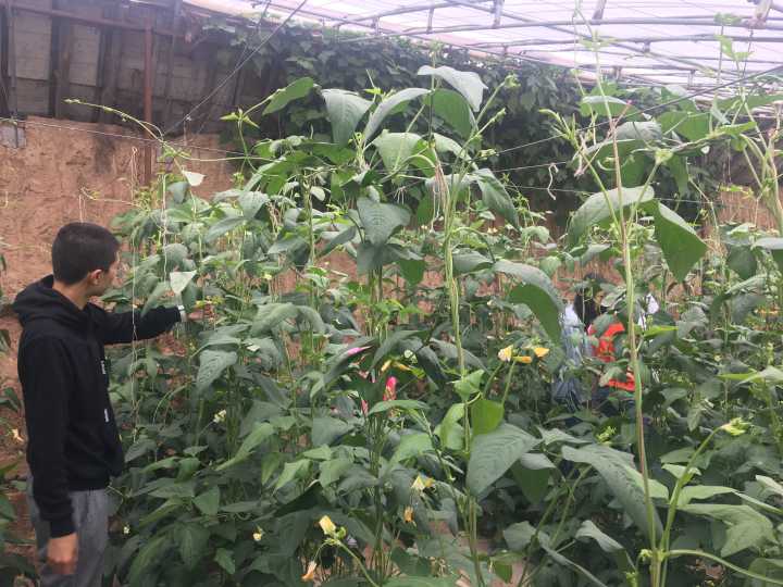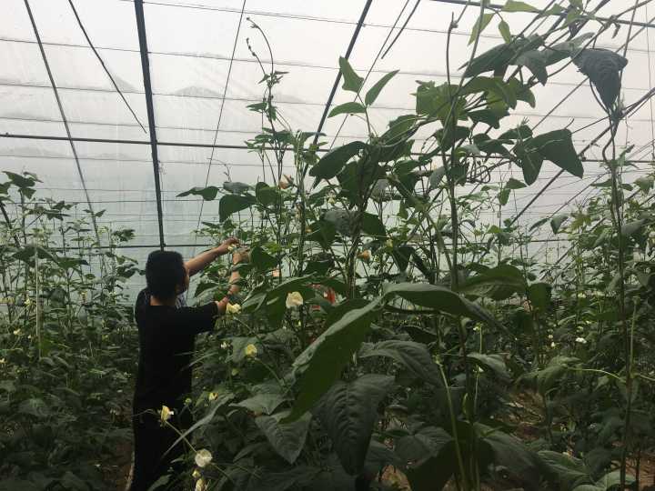 上午8时,天空中飘起小雨,队员们热情丝毫不减,准时集合乘车前往此行的目的地,在途中,队员们热烈地谈论着对于此次活动的目的和内容的理解。九点左右,到达桶张村,和村里的负责人接头后,队员们跟随张马龙同志来到大棚中,学习如何为豇豆引蔓整枝、抹芽。队员们了解到长豇豆长到5~6片叶时,应按逆时针方向把蔓缠绕在壮枝干上,一般需人工辅助绕蔓3~4次,并将第一花絮以下的侧枝全部抹掉,下部老叶和田间落叶及时清除,以减少病虫害。活动中,尽管棚内闷热,但大家都认真摸索着如何把活儿做的又快又好。经过两个多小时的努力,幼嫩的枝蔓被整齐的缠立起来,整个大棚看上去整洁利落。队员们青春激情不减,又与农民谈论着自己操作过程中的疑问与见解,大棚中传来阵阵笑声。