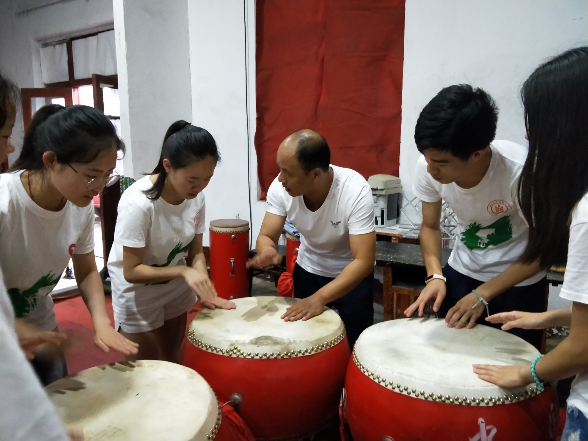在观看了一个小型的行鼓表演之后,队员们在剧院陈金福老师的带领下开始学习行鼓的打法。“记不住不着急,我们再来一遍”、“右左右右左”、“打鼓一定要掌握好鼓点,我们先从最基础的地方学起。”陈老师亲切和蔼的语气,认真负责的教学,让队员们感受到韩城行鼓对任何一个想要走进它的人都张开了臂膀。