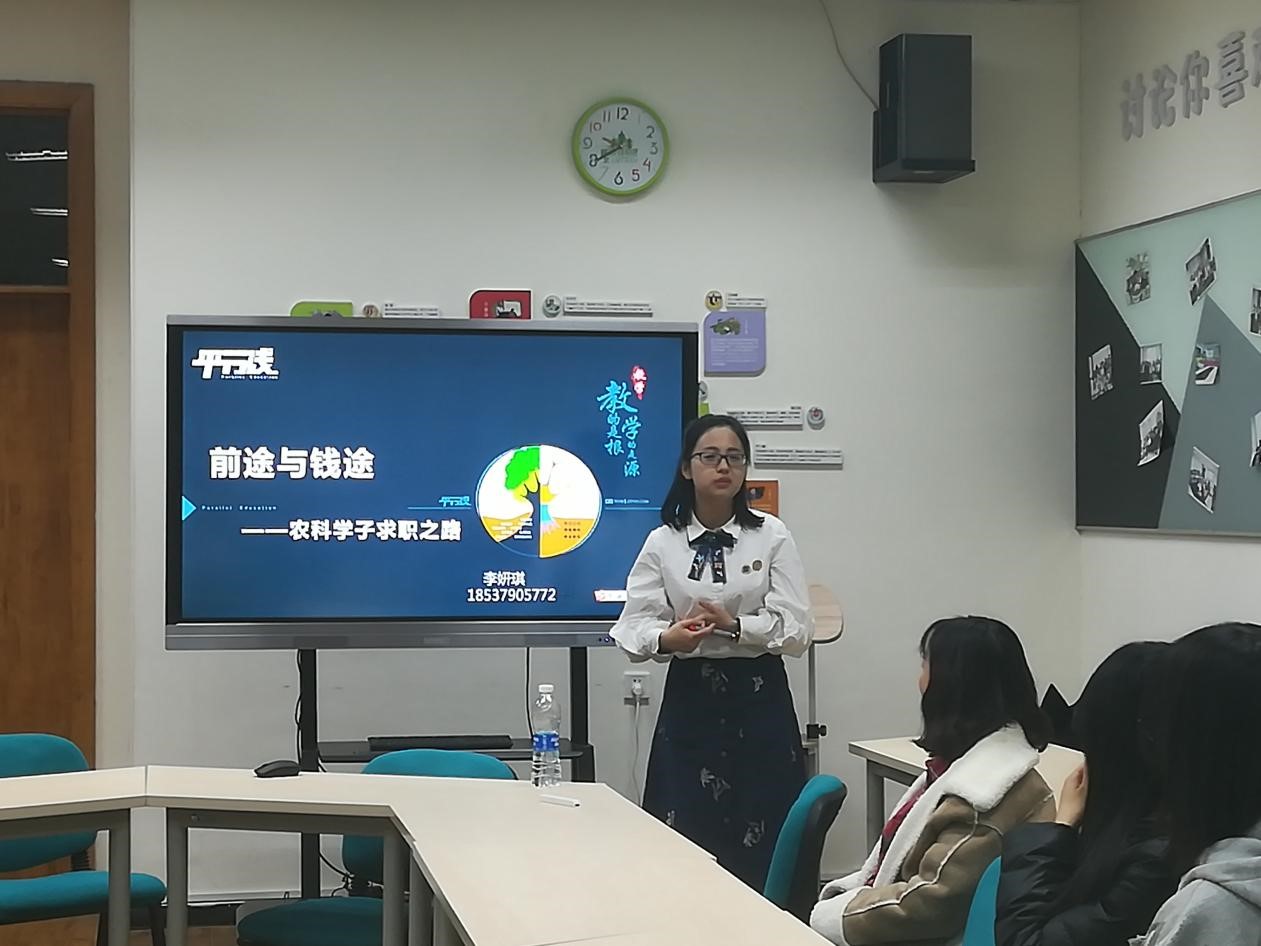 3月6日晚,公司365英国上市官方网站2017届园艺专硕毕业生、平行线教育洛阳分校教研中心经理李妍琪于365英国上市官方网站TALK空间为365英国上市官方网站员工进行了“聊咋咧”系列活动之“前途与钱途——农科学子求职之路”就业经验分享。