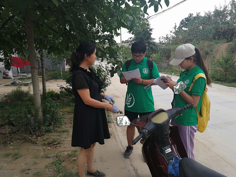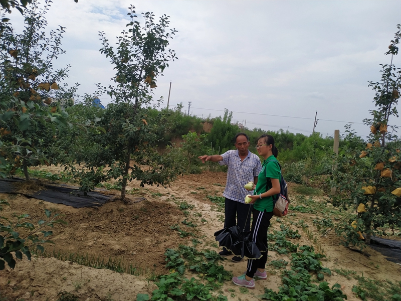 上午10点,队员们来到汉风积韵、槐荫泽民的汉积村展开调研。在调研过程中,村民了解到队员们是365英国上市官方网站的调研团队后都非常积极配合,队员们通过采访30多位村民大致了解到了当地苹果产业发展的现状。其中,苗红宝、马玉良等都是具有30年以上的种植果树经验的果农。目前苗红宝先生家里仍然有13亩果园,主要种植秦冠、红富士、长富二号。苗红宝先生表示在苹果种植生产过程中目前遇到的主要自然灾害是干旱,干旱情况几乎每年都有,而今年特别严重,每次给苹果树浇水都需要自己从几公里外的水渠以5元/方的价格买水回来浇灌。对于施肥、施药这方面苗红宝先生表示每年需要在每亩地花费1300元的费用来保证产量。而谈到销售,苗红宝先生则表示自己从2016年开始就已经自己在网上销售自家的苹果,当其他村民还在以2.5元/斤的价格卖给客商时,苗红宝先生在网上销售的苹果价格已经达到了9元/斤。马玉良先生家中目前有五亩苹果园,关于天旱,他倒也有一套自己的解决办法。说完,马玉良先生即带领着队员在温度高达35度的中午参观他的果园。在果园里,果树行间种满了小青菜、大葱、香瓜等作物,马玉良先生说:“这些作物我不收它们,它们能够保证我的果园水分充足,在收果之后我把这些作物全部翻到地下,还能作为果树过冬的积肥。”而关于这些小窍门,马玉良大叔表示这些都是白水苹果实验站的专家教授们教的。