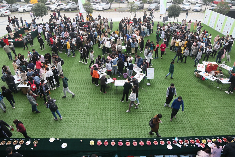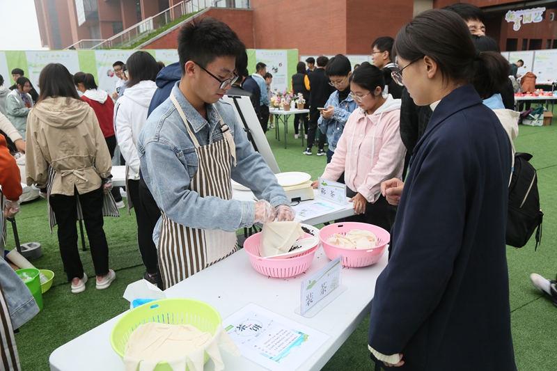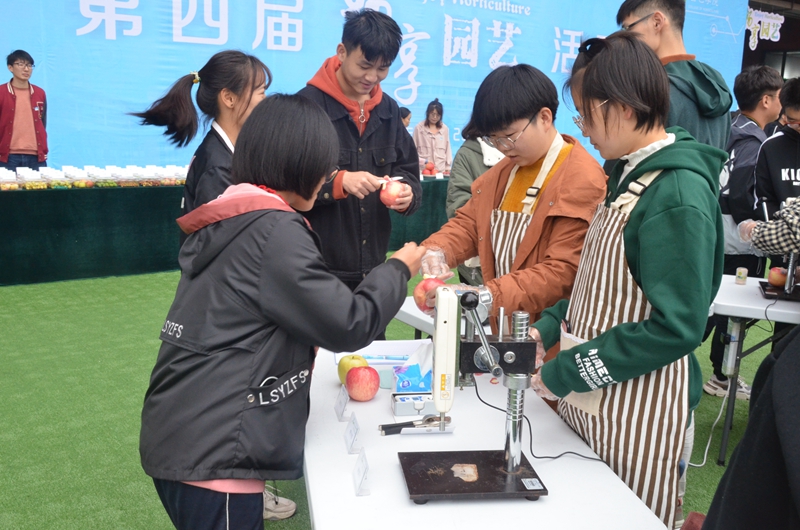 活动现场中,同学们亲身体验了人工种子的制作,为玉兰、牡丹、桃仁等植物种子包裹上了一层胚乳,制作成人工种子。在场的志愿者讲到,同学们只要将其播入土壤中,悉心照料,便能收获种子的成长,同学们切身体会到生命的蓬勃力量。活动中,“插花艺术体验区”也十分热闹,同学们纷纷被花的美丽吸引至此。通过志愿者的讲解和指导,亲手做成了一捧捧插花作品,情人草、满天星、天堂鸟、紫罗兰等供不应求。“茶学知识小课堂”品鉴香茶,有祁门红茶、普洱、大红袍等,它们不光颜色靓丽,喝起来也润喉养肺;另外,在“茶的前世今生”活动区,同学们实践了“盖碗茶艺”、“茶饼压制”的活动,深刻提升了对于传统茶文化的认知。在“果实品质鉴定体验区”,同学们利用机器评估各类苹果的硬度和甜度;“园艺产品品鉴区”,是同学们味蕾的天堂,各个种类的苹果、猕猴桃、梨等摆放在此,供同学们品尝;“园艺产品加工体验区”更是提供给同学们果冻、果酱及水果酸奶等食品,以供同学们享用。“滚石叶拓创作区”、“叶脉书签创意DIY区”、“嫁接小课堂”等活动丰富有趣,让同学们近距离感受园艺的魅力。