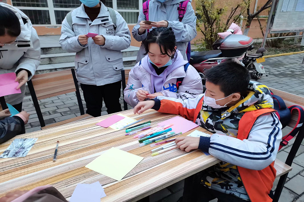 志愿者们提前准备好了明信片和彩笔,在小员工们放学后在邰西社区服务活动中心展开了此次活动。志愿者向孩子们宣传感恩知识,为孩子们发放空白贺卡和明信片,教孩子们给自己想要感谢的人写贺卡和祝福语。孩子们在活动中表现的十分积极,卡片上写着“妈妈,您辛苦了”等感恩父母和老师的话语。写完明信片和卡片后,志愿者和孩子们一起,将写满祝福语的彩纸折成纸飞机、千纸鹤和爱心等模样,送给自己想要感谢的人。