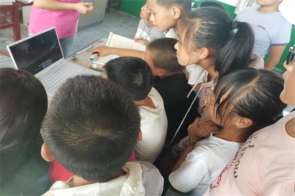 经过筛选,支教团确定了《狮子王》和《冰雪奇缘》两部动画电影片段作为教学内容。课程开始,两位老师拿着电脑走进教室,孩子们在老师的组织下有序地围坐在电脑周围,冯子琪老师首先播放了《狮子王》的片段。放映时,孩子们凑在电脑前小声讨论电影情节,模仿人物发音,随后播放的《冰雪奇缘》同样引起孩子们踊跃地讨论。