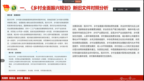 理论教育树思想 今昔对比明要求。紧紧围绕党的二十大和二十届三中全会精神,认真学习习近平总书记关于“三农”工作的重要论述,依托支部成立的政治理论宣讲团,开展以“关于乡村全面振兴规划新旧文件内容对比及对我们提出的新要求”为主题的专题微党课。宣讲团成员、2024级硕士研究生李格在领学中提到:“新发布文件中明确提出发展现代设施农业,这对于我们支部党员来说意义重大,也责任重大。文件中提到鼓励和引导青年入乡发展和就业创业,加强农业农村科技领军人才、青年人才培养,通过科技小院等形式,推动涉农教育与生产实践紧密结合等,这给予了我们涉农青年更广阔的发展平台,要求我们要更加努力成为推进乡村全面振兴的生力军。”在交流研讨中,支部党员于超奇表示:“新规划中更加注重乡村的全面发展,通过今天的学习,让我认识到新规划的实施将对我们产生深远的影响,也为我们提供了更多的发展机会。”同时,权嘉佳也分享了关于本次学习的感想,她说:“近年来,国家在乡村振兴方面已经做出了极大成果,但是还存在一些问题,特别是农村人才缺乏,要通过多方面措施留住人才,呼吁大家多关注农村发展,深入农村做实事。”会后,支部成员纷纷以感悟笔记分享学习感想。