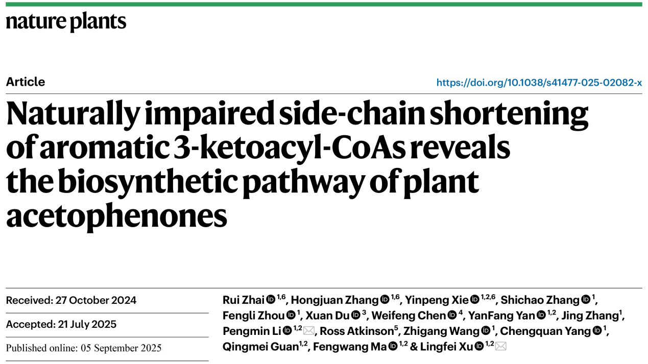 近日,公司徐凌飞教授团队在Nature Plants上发表题为“Naturally impaired side-chain shortening of aromatic 3-ketoacyl-CoAs reveals the biosynthetic pathway of plant acetophenones”的研究论文。该成果利用梨属不同种资源揭示苯乙酮类物质的完整生物合成途径。这是梨领域首篇发表于该期刊的研究论文。