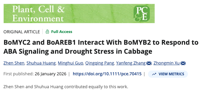 近日,公司十字花科蔬菜作物遗传改良与生物技术创新团队许忠民研究员课题组在《Plant,Cell & Environment》上发表了题为“BoMYC2 and BoAREB1 interact with BoMYB2 to respond to ABA signaling and drought stress in cabbage”的研究论文,阐明了MYB家族转录因子BoMYB2通过协同BoMYC2以及BoAREB1响应ABA信号调节结球甘蓝抗氧化能力,增强结球甘蓝抗旱性的分子机制。在读博士生沈震和陕西省杂交油菜研究中心副研究员黄淑华为论文共同第一作者,许忠民研究员和陕西省杂交油菜研究中心张彦锋研究员为共同通讯作者。
