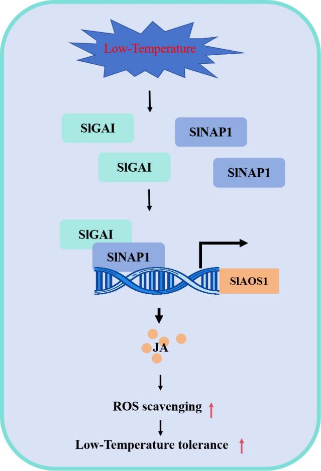 该研究揭示了番茄中NAC-DELLA协同调控JA生物合成的低温应答通路:低温诱导SlNAP1与SlGAI表达,二者互作增强SlAOS1转录表达,促进JA合成,进而激活抗氧化系统、维持细胞膜与光合系统稳定,最终提升低温耐性。研究成果完善了园艺作物低温逆境下激素信号与转录调控的交叉网络,为设施番茄耐低温分子设计育种提供重要基因资源,也为茄科作物抗逆遗传改良提供新思路。
