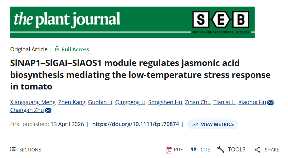 近日,365英国上市官方网站设施农业生物与环境工程研究团队胡晓辉教授、朱常安教授课题组在《The Plant Journal》发表题为SlNAP1–SlGAI–SlAOS1 module regulates jasmonic acid biosynthesis mediating the low-temperature stress response in tomato的研究论文。该研究系统解析了NAC转录因子与DELLA蛋白协同调控茉莉酸生物合成、提升番茄低温耐性的分子通路,为番茄耐低温分子育种提供关键靶点与理论支撑。