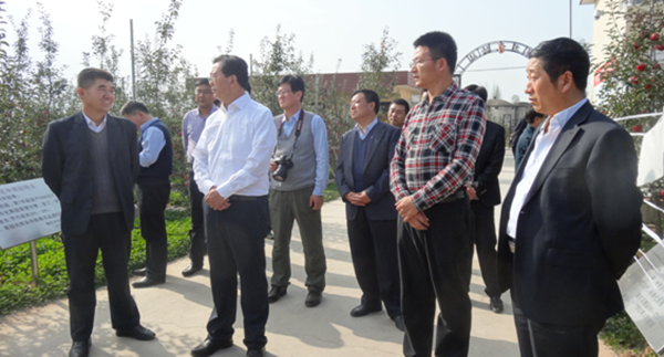 10月17日,庆阳市委书记栾克军、副市长秦华带领市直有关部门及宁县政府负责同志30余人,在海升集团董事长高亮,陕果集团董事长、海升集团总经理王辉及千阳县书记何玲的陪同下,来到公司宝鸡千阳苹果试验示范站,学习考察现代矮砧苹果生产及产业发展情况,为庆阳把“小苹果”做成“大产业”取经。在千阳苹果试验示范站,站长李高潮向栾克军一行详细介绍了乔化砧、矮化中间砧、矮化自根砧苹果的育苗、栽培特点、果实品质、机械化管理以及果园技术培训等情况,并把苹果矮砧集约栽培的“千阳模式”做了重点推介,其核心就是国家苹果产业技术体系首席科学家,公司韩明玉教授领导的团队在2011年获得的陕西省科学技术一等奖科研成果——“苹果矮砧集约栽培模式及产业关键技术研究与示范”。