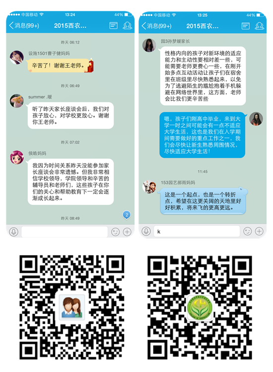 在迎新期间,公司专门印制“西农园艺”和“新生家长交流QQ群”网络平台二维码,放置在迎新点的家长休息区,家长拿出手机扫描二维码即可轻松加入QQ群进行交流,并通过微信公共平台,在第一时间接收公司及员工的各类资讯。