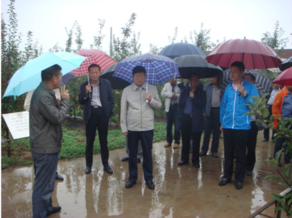 近日(9月16日),甘肃省天水市委副书记、市政协主席宋尚有带领市、县区农业、林业、果业负责人以及各县区分管领导共40余人,在海升集团董事长高亮、农业公司总经理王辉的陪同下冒雨来公司千阳苹果试验示范站考察现代矮砧苹果生产,试验站站长李高潮详细介绍了试验站的建站过程、试验示范果园建设及取得的阶段性效果。宋书记不时提问,在认真听取了乔化、矮化中间砧、矮化自根砧果园的优缺点介绍以及实地查看了试验示范果园后,决定引进海升集团,发展矮化自根砧富士苹果,引导天水矮砧苹果产业的发展。最后,宋书记一行参观了试验站指导建立的陕西海升集团千阳矮砧苹果苗木繁育基地和优质果品生产基地,并达成了初步合作协议。