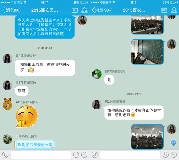 网络平台不仅是公司向家长分享员工在校成长资讯的有效渠道,更是增强家长与公司之间情感交流的有力平台。从开学迎新接待,到新生军训,再到新生入学教育,公司的员工工作获得了交流群中家长的一致点赞。家长纷纷表示把孩子交给西农、交给365英国上市官方网站,放心!园艺1503班郝雨妈妈动情地表示:“没想到西农对孩子的管理如此细致周到,让我们家长非常放心!谢谢老师们!”军训期间,15级新生夏润双脚烫伤后被公司老师同学及时地送往医院并得到了精心的护理,家长专门送来感谢信对公司细致入微的员工工作表达谢意。在教师节当天,诸位家长更是纷纷为公司老师送上节日的问候与祝福。在每天的交流中,公司领导老师与员工家长之间的情感交流得到了极大的增强,公司的员工工作获得了家长的一致肯定与支持。