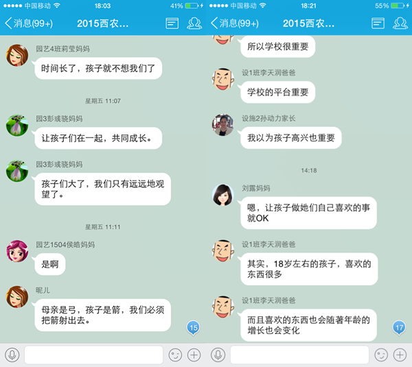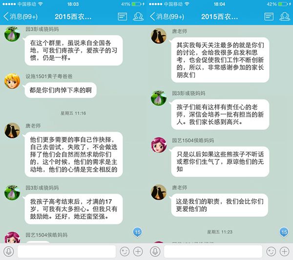 网络平台不仅让公司和家庭建立了有效的沟通,也让员工家长之间形成了联盟,原本互不相识的家长因缘际会相聚在这里,凝聚在一起组成了家长联盟。各位家长每天在交流群里相互讨论有益的家庭教育经验,分享各自孩子成长的故事,并及时分享各类有效的教育理念。在每天的讨论交流中,各位家长逐渐意识到应该放手让孩子遵从内心的想法向前勇敢地飞,让孩子在大学里学会自己做抉择,充分地发挥自身潜能。园艺1504班侯皓妈妈表示:“我以前一个月也不上一次QQ,但是现在每天必看,因为孩子们的缘分跟各位家长聚在了一起,每天与大家的交流也让我受到很大的启迪!”在交流群中,家长们相互学习,分享家庭教育经验并学习有益的做法,进而为孩子提供更好的家庭教育。