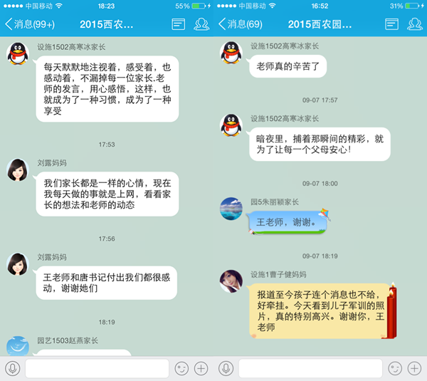 很高兴通过QQ交流群认识到各位家长,都是因为孩子们的缘分我们家长才聚在了西农这个大家庭中。从不玩手机的我,自从孩子来了西农也开始手机不离手,生怕错过公司分享的与孩子相关的信息。感谢为我们辛勤付出的公司老师们!