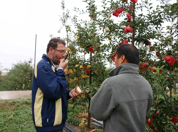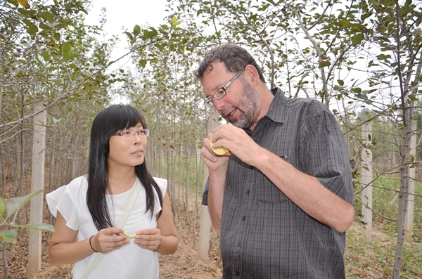 学术交流期间,在公司经理马锋旺等老师的陪同下,Richard Keith Volz教授参观了苹果抗性育种团队的育种基地以及公司洛川苹果试验站,现场鉴评了近年来团队选育的部分优系果实,在优系评价以及杂交苗培育方面给出了很好的建议。