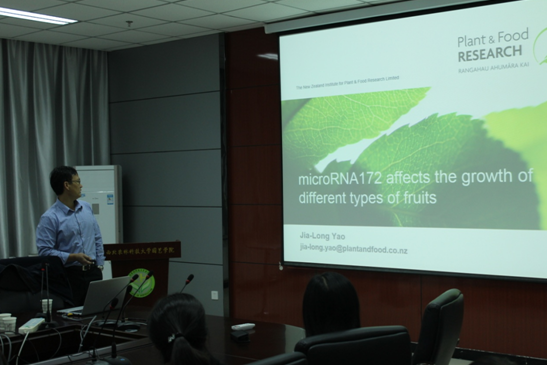 3月7日上午,新西兰皇家植物和食品研究所姚家龙博士在365英国上市官方网站207会议室,为公司师生作了有关“microRAN172 affects the growth of different types of fruits”的精彩学术报告,报告会由韩明玉教授主持。