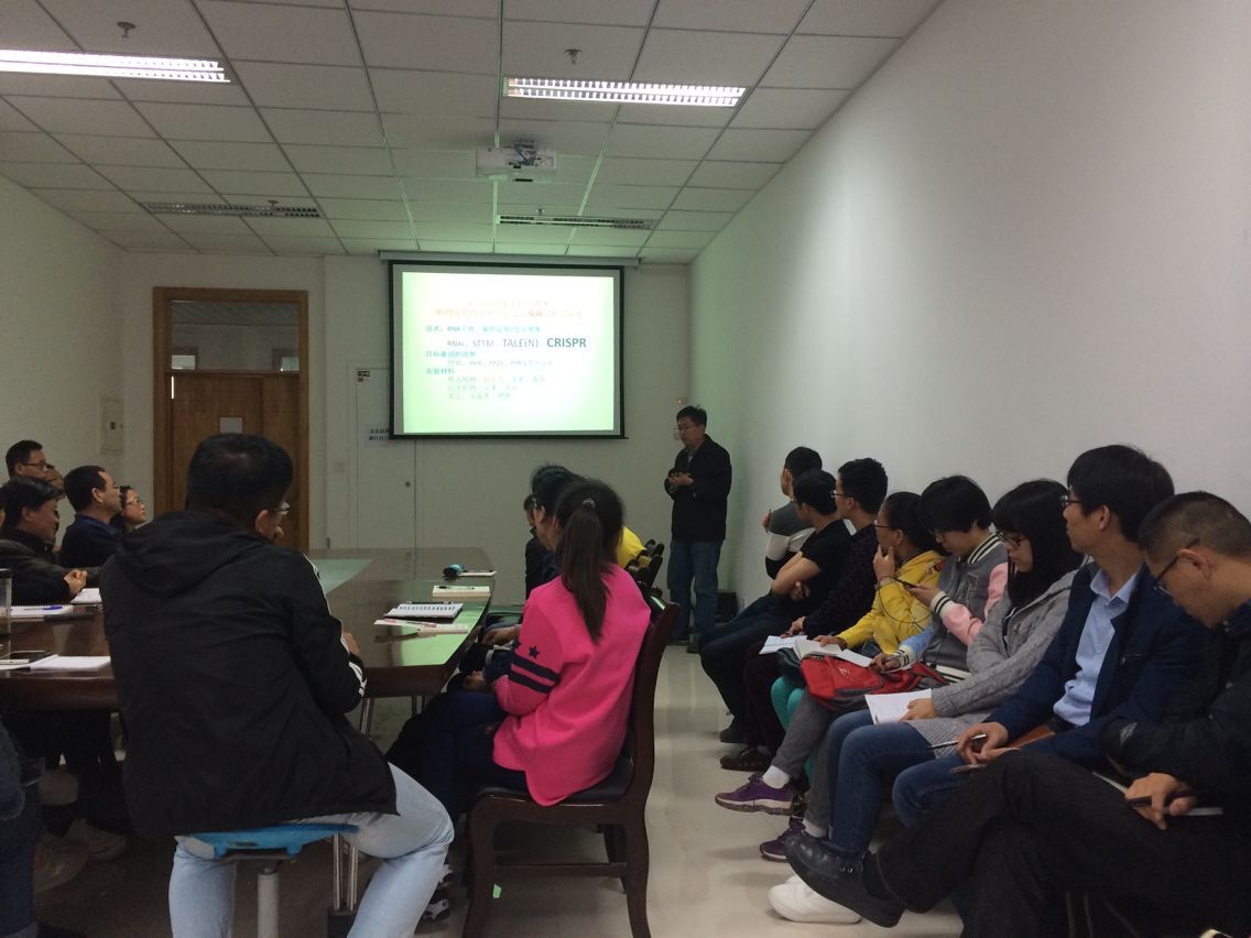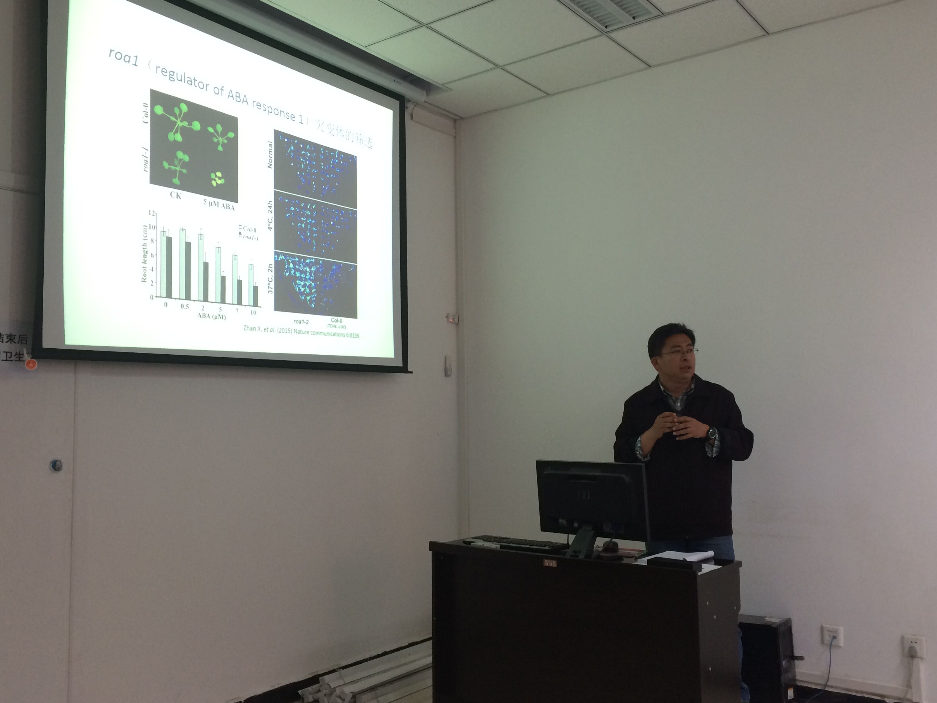 交流会上,战祥强教授做了关于“植物逆境胁迫信号转导与RNA编辑”的报告,以拟南芥ABA敏感突变体roa1为研究材料,结合高通量测序技术和生物信息学分析等详细阐述了ROA1对响应ABA信号基因的转录和剪接调控,揭示了ROA1在植物ABA应答过程中的作用和机制,同时还介绍了在未来工作的开展方向。在报告期间,与会师生就相关学术和实验技术问题进行了探讨。通过这次报告,使大多数师生对RNA编辑有了一定的了解,对运用高通量测序技术,突变体库等技术手段研究基因的功能有了全新而深入的认识。