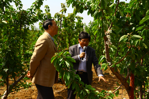 公司试验站首席科学家蔡宇良教授介绍了铜川果树试验站的工作开展情况,主要介绍了苹果矮砧密植高纺锤形集约化栽培模式、樱桃矮化抗根癌砧穗组合、超细长纺锤形、多主干篱篦形及宽窄行V字矮密栽培模式、桃高光效主干形栽培模式以及水肥一体化管理技术。高武斌询问了试验站驻点人员工作、生活情况,对试验站所取得工作成绩予以肯定,并希望试验站通过开展试验研究、示范推广工作引领我省果业转型发展新方向。到试验站参观的还有我省各市、县果业局局长及技术骨干。