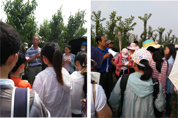 同学们在认真听取专家讲解桃(左)和樱桃(右)的栽培技术