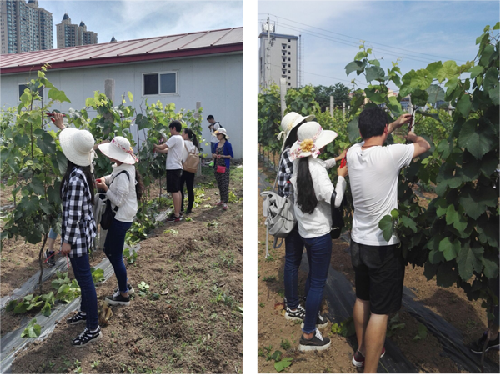 同学们在练习葡萄的夏季修剪技术