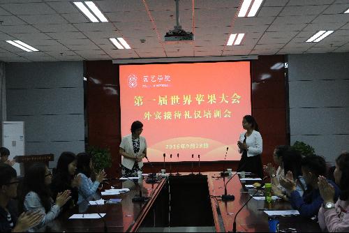 苹果科学领域的学术盛会——第一届世界苹果大会,在中国农业部和陕西省人民政府的大力支持下,将于2016年10月10日至16日在陕西举办,由国际园艺学会、中国园艺学会和中国工程院主办,由公司及其他相关单位承办。为了确保本次会议的顺利进行,同时展现公司学子良好的精神面貌,近日,公司面向全校进行了第一届世界苹果大会志愿者选拔及培训等工作。