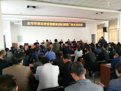 为进一步发展壮大庆阳苹果产业,提升各级果业管理人员和技术干部的业务水平,2017年4月11日-13日,“庆阳市苹果花果管理暨果园机械推广技术”培训班在公司甘肃庆城苹果试验示范站举办。参加培训的学员有庆阳市8县区果业部门负责人、庆阳市苹果专家、果业合作社负责人及广大果农等160余人。本次培训由庆阳市果业局、农机局举办,庆城苹果试验示范站承办。