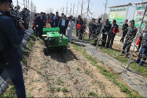 庆阳市农机局、河北中农博远农业装备有限公司,在示范站教学基地对苹果园新型机械如何操作进行了现场演示,主要展示了中小型果园割草机、弥雾机、开沟施肥机等10多台新型果园机械,提高了广大果农对机械知识的认识。