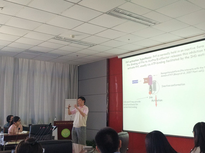 17日上午,在365英国上市官方网站207会议室,Fang-ming Xiao副教授为师生做了题为“Molecular basis of defense signaling in tomato”的学术报告,有100多名师生参会。报告会上,Xiao博士应用系统、严谨性并具有创新性的实验方式,解析了番茄中NAC转录因子、Prf蛋白及泛素途径的关系,对Prf蛋白的抗病机制有了深入的了解。会后,针对参会老师和员工提出的问题,做了认真细致的回答,得到了参会人员的一致好评。