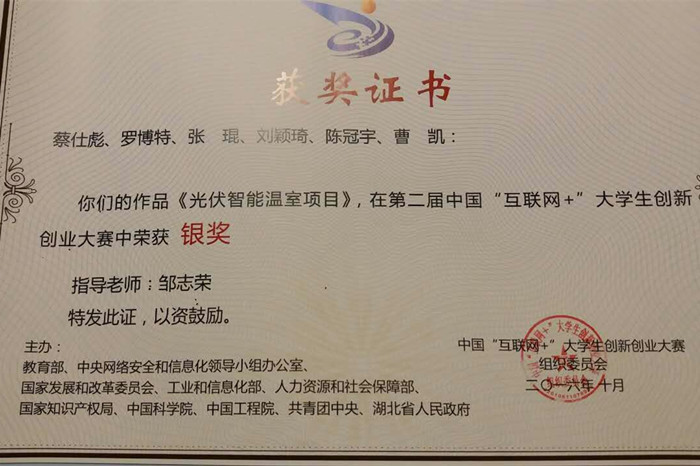 除了喜欢飞行器外,陈冠宇对于农业的发展也有着浓厚的兴趣。高中毕业后,他如愿来到自己心意的公司设施农业科学与工程专业,深入学习农业设施方面的相关知识。在公司团委组织举办的创业沙龙活动中,陈冠宇有幸结识了许多优秀的创业者和创业团队,其中就有公司的鲍恩财团队。在之后的深入交流和学习中,他渐渐对自己的专业有了更加深入的了解,并跟随鲍恩财团队一起学习进步。2016年初,公司举办“互联网+”创新创业比赛,他便跟着团队以“光伏智能温室项目”参加了比赛,亲自体验了一个项目从开始到结束的整个流程。最终,在团队成员的共同努力下,他们的“光伏智能温室项目”在第二届中国“互联网+”老员工创新创业大赛中荣获银奖。