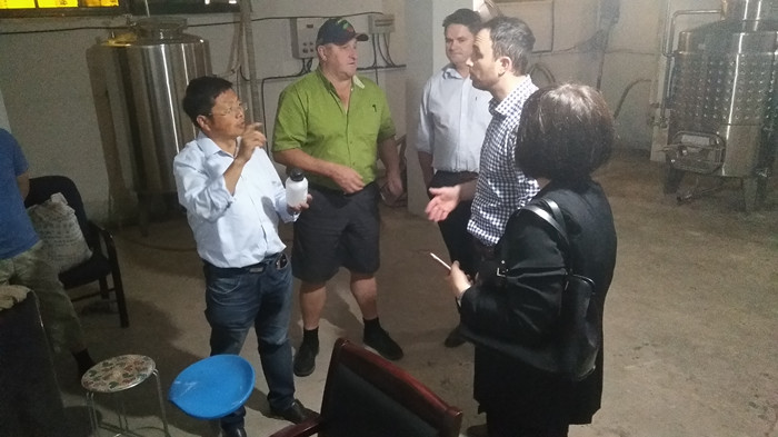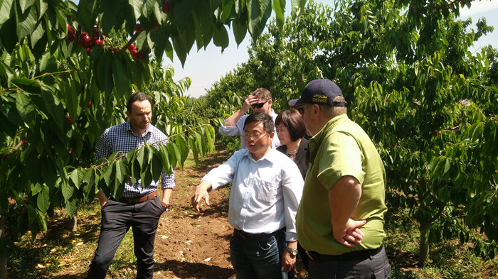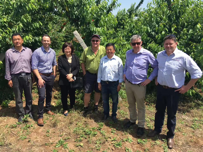 5月23日,澳大利亚万地河谷农场首席执行官Tim Jones、卡拉庄园首席执行官Michael Rouget、樱桃山农场销售经理Craig Boulton以及澳大利亚新诺商务中心董事长Philip Webley和常驻南京代表蒋蓉一行,来公司渭河樱桃试验示范站考察。先后参观了樱桃不同的栽培模式、樱桃种质资源圃和樱桃果酒加工厂。