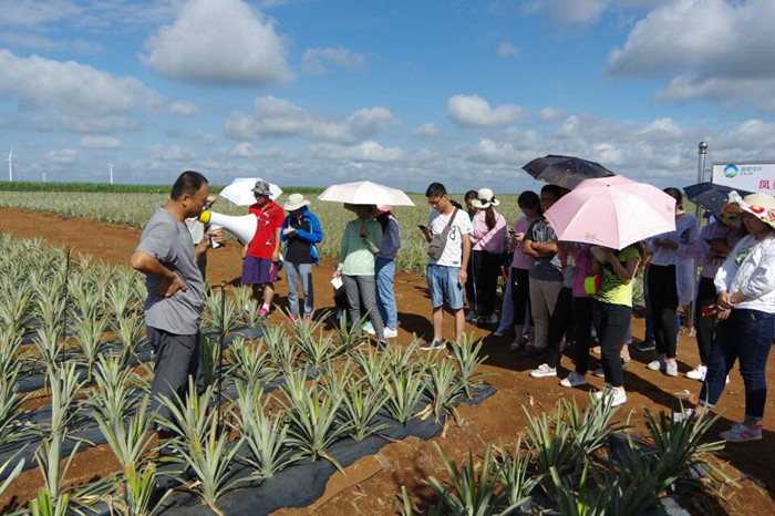 南亚热带作物研究所孙伟生老师带领同学们在湛江市、徐闻县参观了菠萝种质资源圃和标准化种植示范基地。主要的栽培品种有“台农16号(甜蜜蜜) ”、“台农17号”、“台农22号”、“金菠萝”、“珍珠菠萝”和“黄金菠萝”等。“甜蜜蜜”菠萝肉白甜脆,是深受消费者喜爱的优良品种之一。孙伟生老师指导生产的白肉菠萝“甜蜜蜜”,实现了工厂化育苗和标准化生产,大大提高了产业效益。