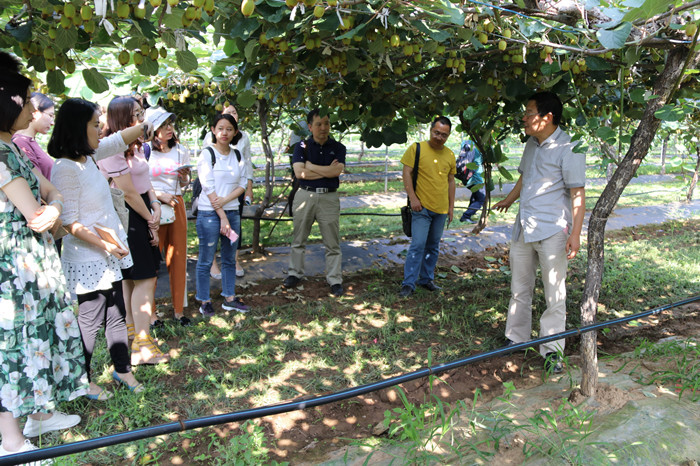 驻站专家姚春潮研究员向采访团介绍猕猴桃试验站的新技术展示