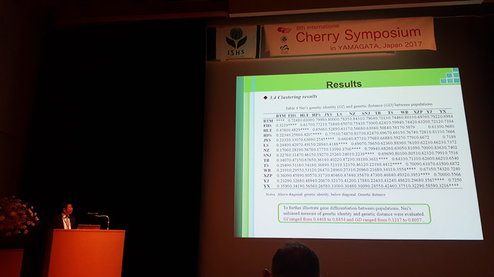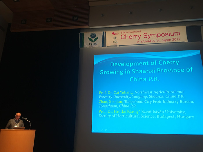 期间,来自美国、中国、日本、澳大利亚、意大利、匈牙利等29个国家、230多位专家、学者及产业内同行,关于樱桃砧木与品种评价、育种技术、栽培管理技术、病虫害防治、果树营养与肥水管理、花期授粉、果实生长发育、樱桃采前及采后处理等进行深入探讨,各国著名樱桃专家参会代表分别对各国的樱桃产业现状与发展趋势做了学术报告。公司蔡宇良教授代表公司樱桃课题组和陕西省现代樱桃产业技术体系关于樱桃科研进展做了精彩的汇报,报告题目为:“Studies on Genetic Diversity and Genetic Structure of Chinese Wild Cherry Prunus pseudocerasus L. ”。此外,课题组引智专家、匈牙利圣·伊斯特万大学Károly Hrotkó教授关于我省樱桃产业发展现状和趋势做了详细的报告,报告题目为“Development of Cherry Growing in Shaanxi Province of China P.R. ”。