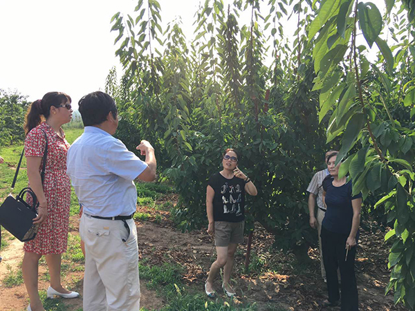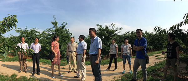 期间,考察了桃栽培模式、新品种选育及品种推广情况,现场品评了蟠桃新优系,并给予了赞赏。考察了樱桃新品种、贮藏加工研发情况以及樱桃超细长纺锤形栽培模式和多主干篱臂式试验示范的成效,并建议将多主干篱臂式作为观光农业樱桃栽培模式予以推广。其次,询问了果园生物驱虫试验情况,以及樱桃果蝇防治技术研发和效果。