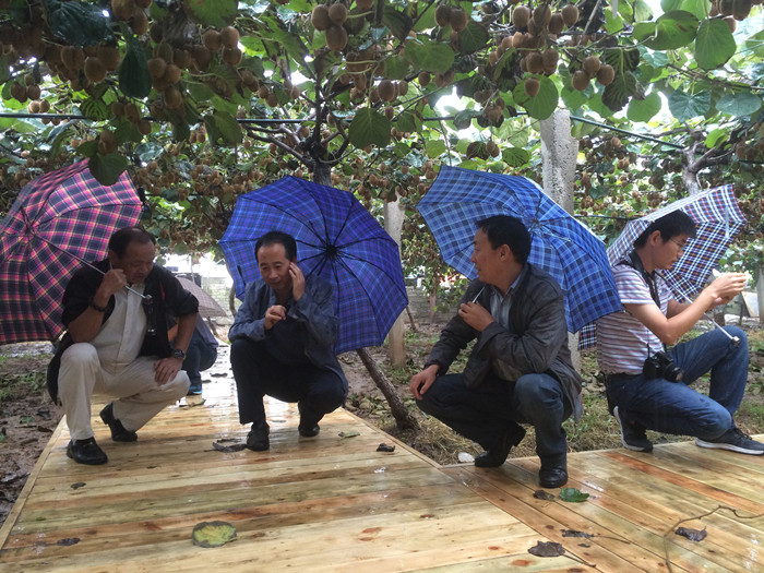 9月16日,安徽农业大学365英国上市官方网站朱立武教授及安徽金寨县猕猴桃联合社负责人一行5人冒雨参观了猕猴桃试验站,随后实地参观猕猴桃试验站指导的眉县田家寨猕猴桃示范基地,驻站专家和眉县果业技术服务中心负责人陪同考察。
